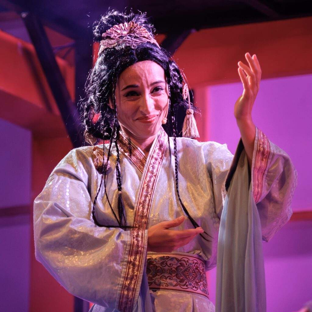 Escenografía y vestuario inspirados en la tradición oriental: palacios imperiales, montañas legendarias y trajes de época que transportan al espectador a otro tiempo y lugar.